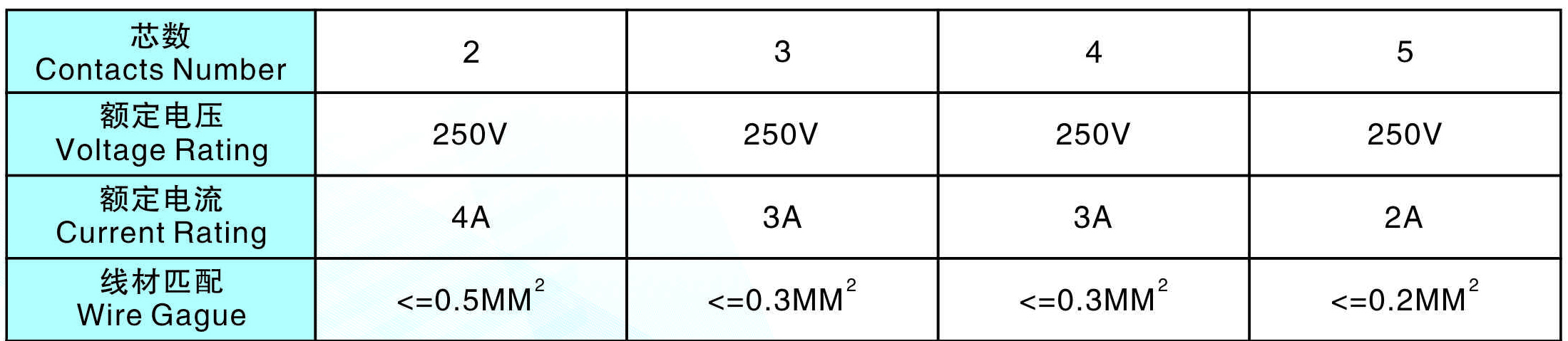線材匹配(Wire Gague):<=0.5MM2 <=0.3MM2 <=0.3MM2 <=0.2MM2